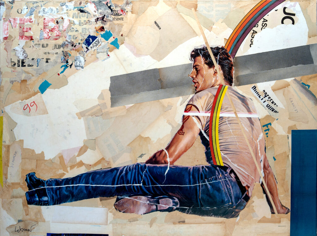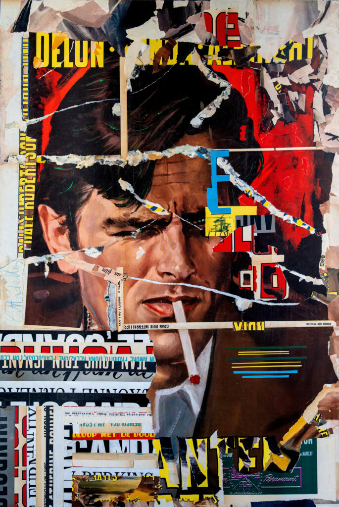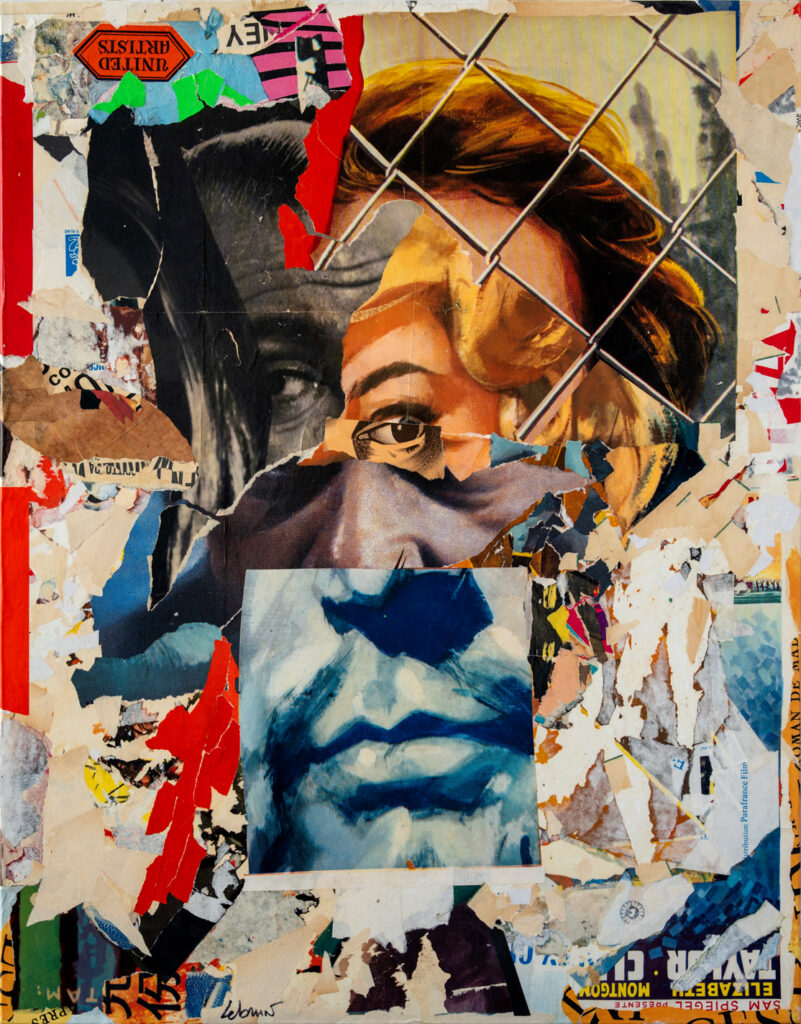 Dominique Lebrun crée ses toiles en déchirant les affiches de cinéma vintage de sa collection. Il choisit chaque élément, comme un peintre ses tubes de couleur, ajoutant parfois des touches d’acrylique.